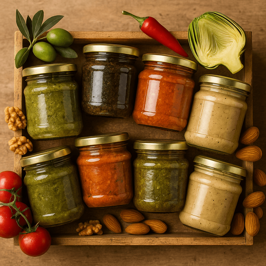 The olive patés are delicious on toasted bread or bruschetta, while the chili paté adds a fiery touch to aged cheeses and meat dishes. The artichoke paté stands out with its creamy texture, pairing beautifully with savory pies and pizzas. The Sicilian pestos are ideal for pasta, appetizers, or as versatile condiments to enhance everyday meals.