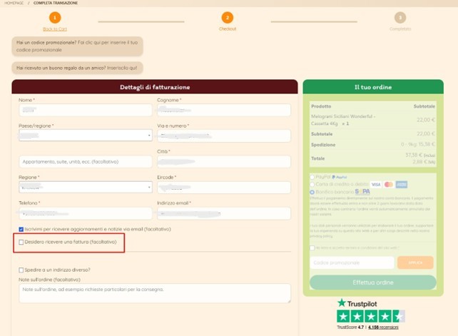 At checkout, you will find the option ‘Would you like to receive an invoice?’ By selecting this option, you can enter your billing information to receive an electronic invoice in accordance with Italian law. On this page, we call it ‘self-invoicing’ as reported in the internal help section and in the site’s operating instructions.